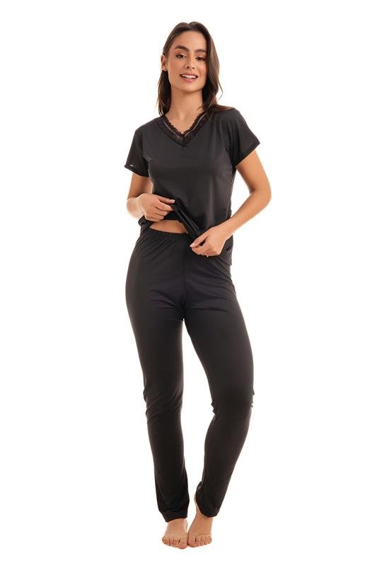 PIJAMA LONGO MANGA CURTA EM LIGANETE COM DETALHE EM RENDA
